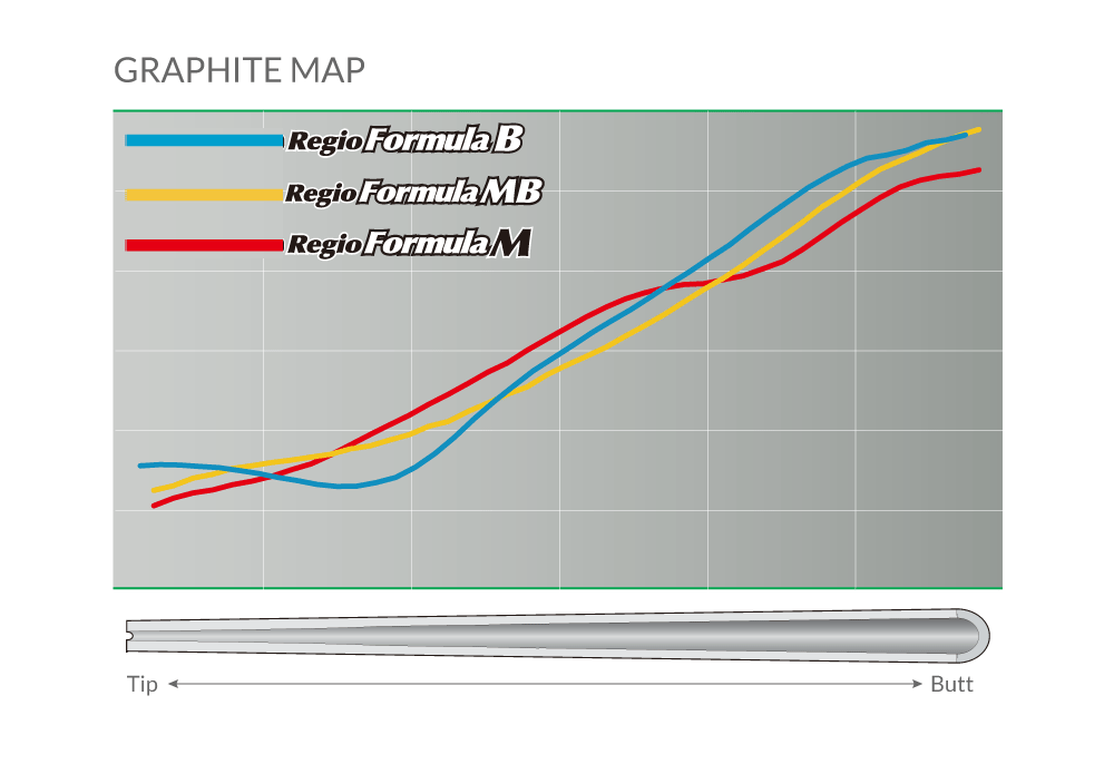 Regio Formula MB series shafts flex moderately, yet they feature a slightly rigid grip that feels solid for an easier swing and a slightly rigid tip that suppresses the inaccuracy and variation at impact.